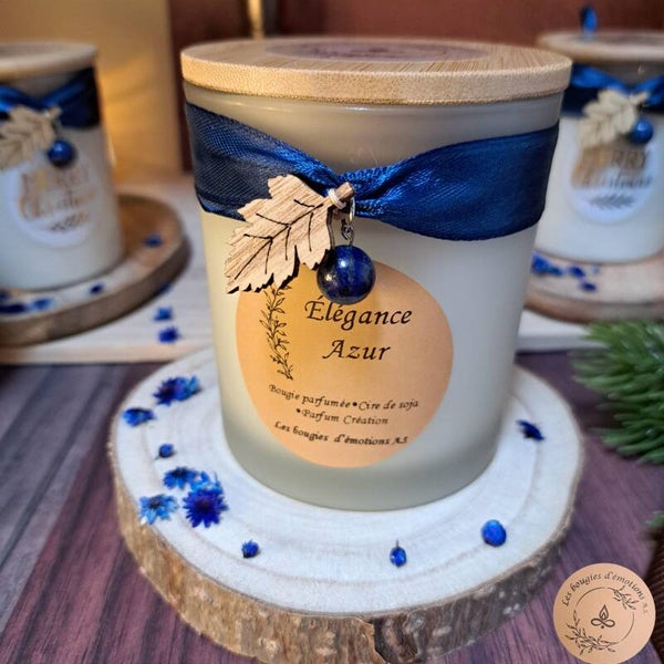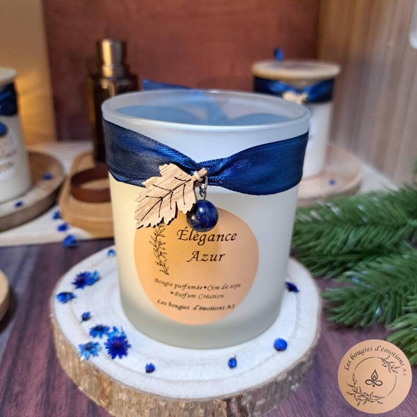 Découvrez "Élégance Azur" la nouvelle bougie Parfum Création qui redéfinit le luxe, parée d'un ruban bleu, et d'une perle naturelle en Lapis Lazulli. "Elle incarne le raffinement d'une façon naturelle."