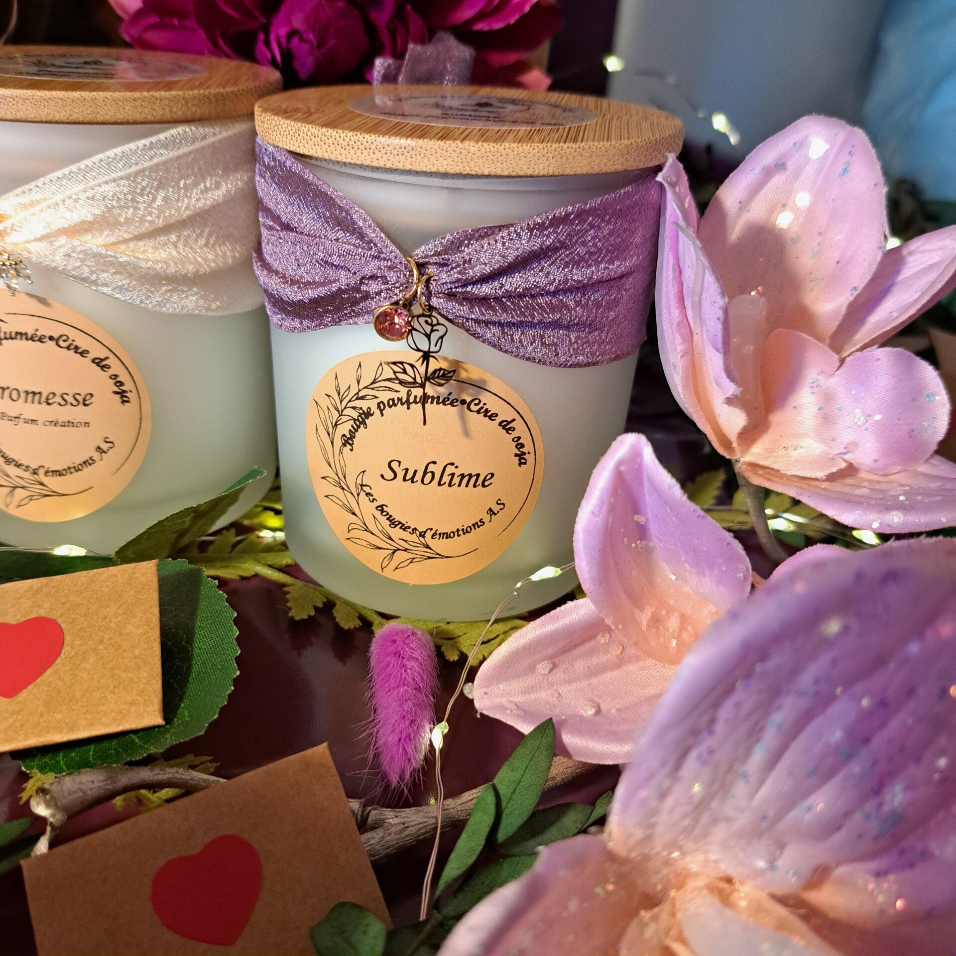 Chaque bougie contient une capsule Message caché, Pendentifs sur le ruban, Une mini carte à personnaliser
